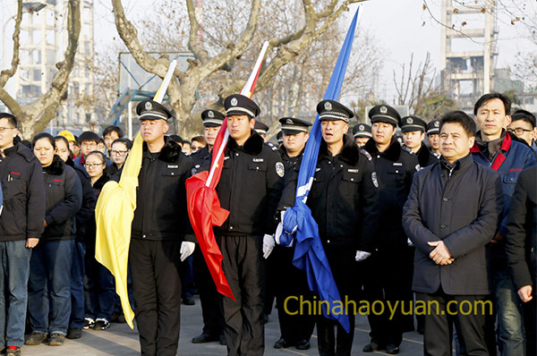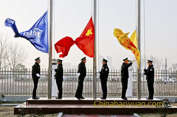 2018年元月1日8時18分,公司經(jīng)警伴隨著激昂的《陽光地代》、邁著整齊的步伐入場。隨后,鮮艷的五星紅旗在莊嚴的國歌中冉冉升起、隨風飄揚。