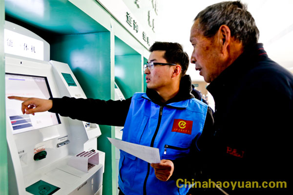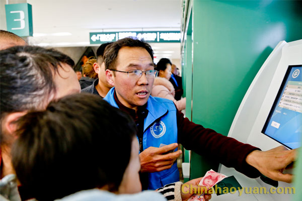 “骨科科診室在一樓西頭”、“預約取號在自助機上就可以辦”、“方便門診在一樓大廳玻璃門東側(cè)內(nèi)”、“ 建卡、掛號、繳費、劃價、打印報告單都可以在自助機上完成”。來自昊源志愿者協(xié)會的志愿者們,耐心而又禮貌地對絡繹不絕前來詢問的患者說道。