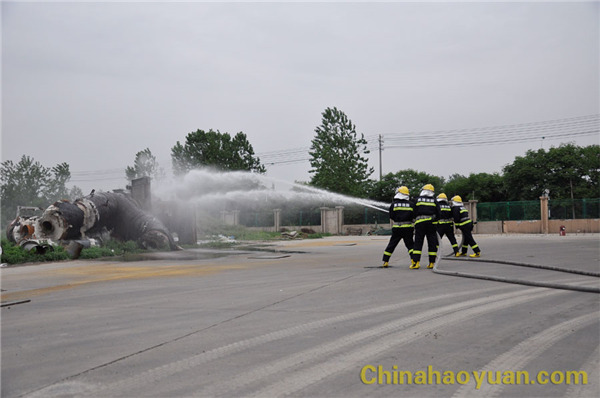 演練以航天爐系統(tǒng)甲醇罐區(qū)西部設(shè)備著火為假想,進行及時撲滅著火,并對著火現(xiàn)場進行人員搜救。