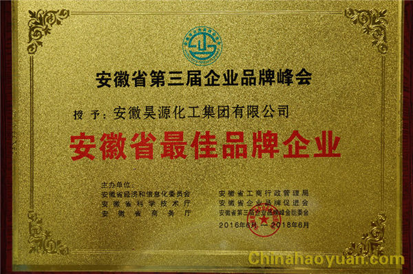 2016年6月18日,由安徽省經(jīng)濟(jì)和信息化委員會(huì)、安徽省科學(xué)技術(shù)廳、安徽省商務(wù)廳、安徽省工商行政管理局和安徽省企業(yè)品牌促進(jìn)會(huì)共同舉辦的安徽省第三屆企業(yè)品牌峰會(huì)在安徽省人大會(huì)議中心隆重舉行,省有關(guān)領(lǐng)導(dǎo)及企業(yè)代表100余人出席會(huì)議。安徽昊源化工集團(tuán)有限公司在本屆企業(yè)品牌峰會(huì)上榮獲“安徽省最佳品牌企業(yè)”稱號(hào),并被授予安徽省企業(yè)品牌促進(jìn)會(huì)理事單位。