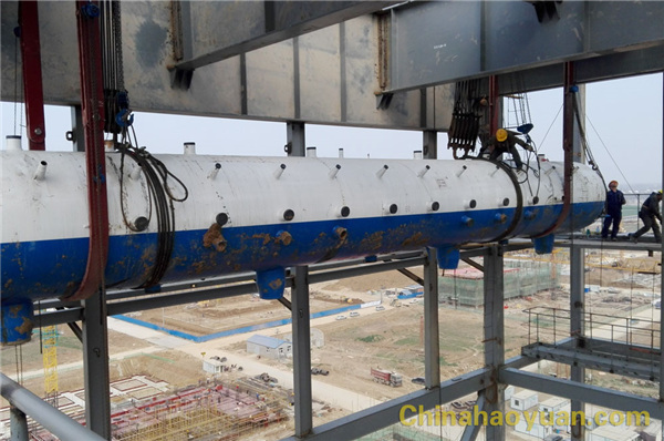 在昊源公司口孜園區(qū)項目鍋爐組的不斷努力下,經(jīng)過四個多月的緊張施工,鍋爐主體框架已基本安裝到位。2017年3月11日,在鍋爐項目組的監(jiān)管下,施工單位密切配合,按照項目進(jìn)度如期對汽包進(jìn)行吊裝。汽包于上午9時許開始吊裝,經(jīng)過數(shù)小時忙碌,于下午15時許一次吊裝成功。汽包就位后,水冷壁、旋風(fēng)分離器等相關(guān)設(shè)備、部件的安裝隨后進(jìn)行,整個安裝工作面全面展開。鍋爐工段是口孜園區(qū)項目最早開車運(yùn)行的工段,鍋爐項目組全體成員克服困難,確保項目如期完工。