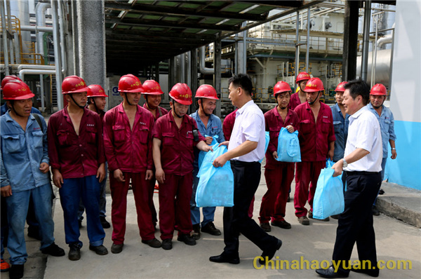 8月23日,阜陽(yáng)市總工會(huì)黨組織成員、經(jīng)審會(huì)主任吳燕,勞動(dòng)保障部長(zhǎng)徐彪一行,帶著礦泉水、綠豆、清涼大禮包等防暑降溫用品,深入昊源公司生產(chǎn)一線,為高溫期間堅(jiān)守生產(chǎn)崗位一線員工送去清涼。公司副總經(jīng)理、工會(huì)主席高玉磊,總經(jīng)理助理吳珍漢陪同。