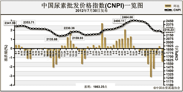 上周(7月23日-7月27日)國內(nèi)尿素市場需求下滑,價格下跌。7月30日CNPI為2215.23點,環(huán)比下跌32.62點,跌幅為1.45%;同比下跌126.76點,跌幅為5.41%;比基期上漲351.98點,漲幅為18.89%。CNPI保持短暫穩(wěn)定后繼續(xù)下滑。